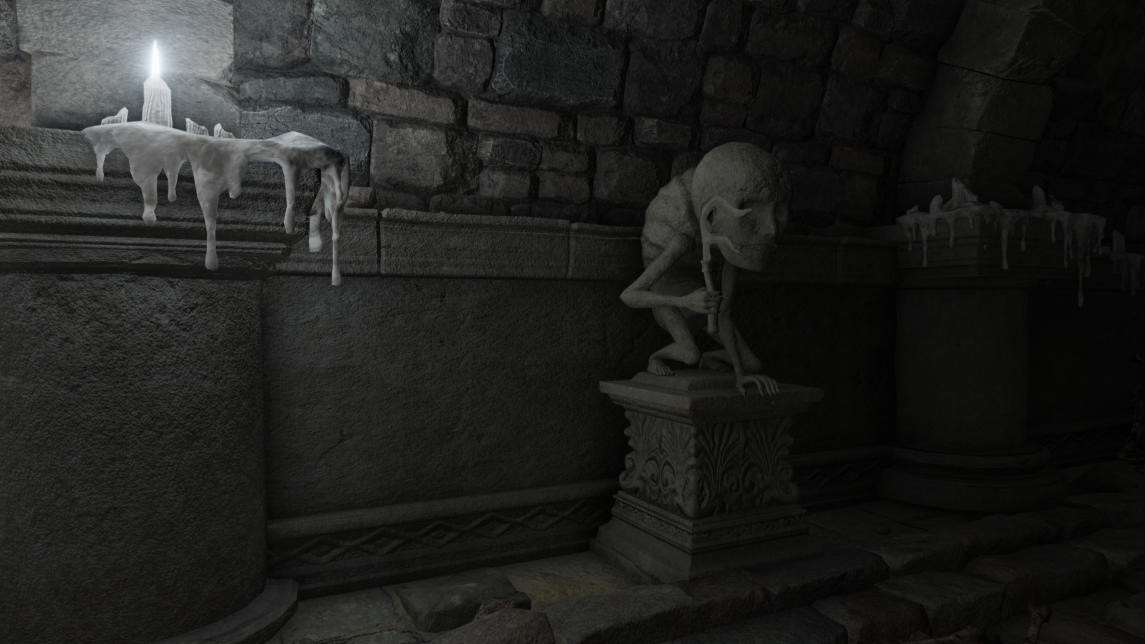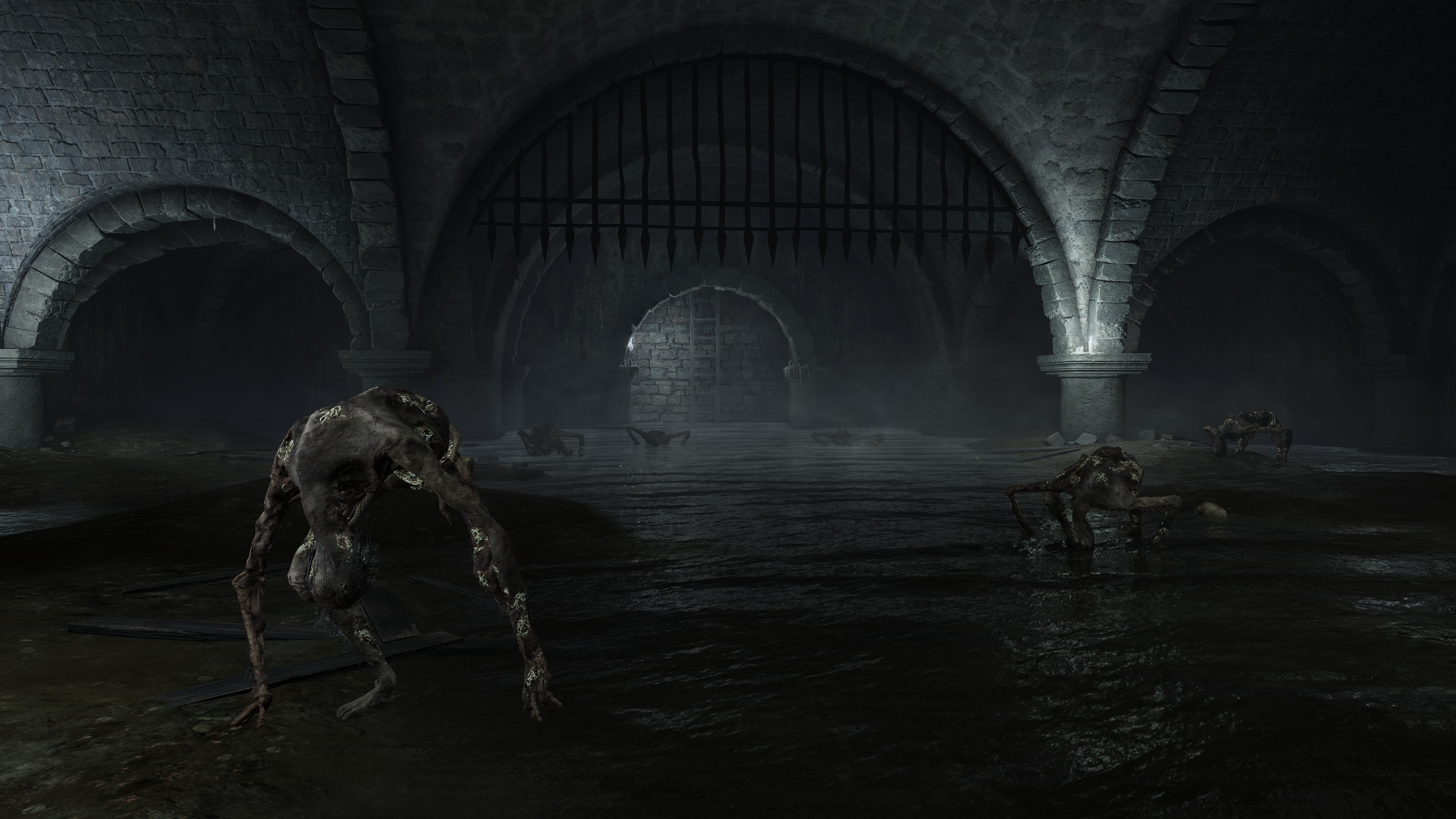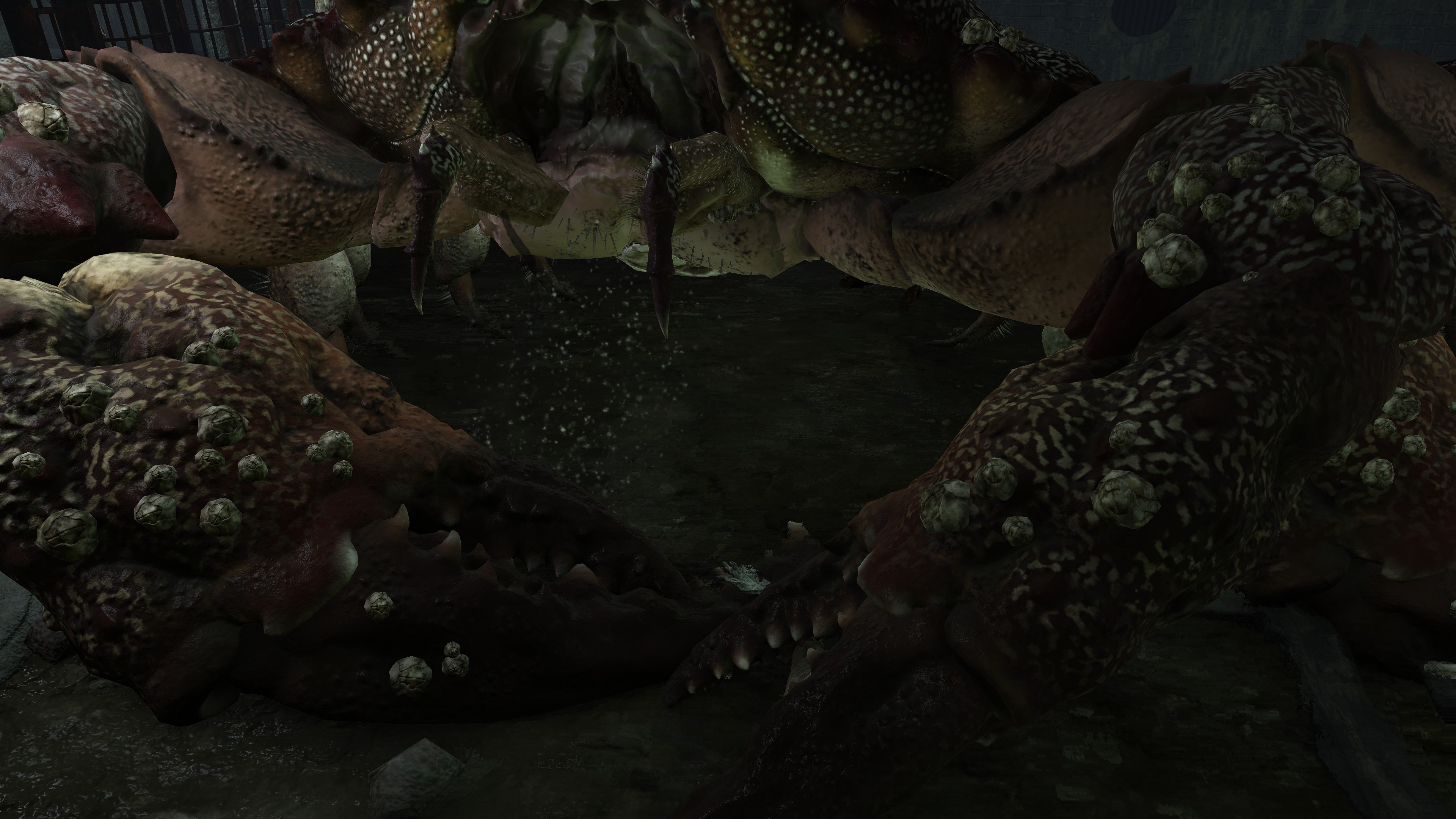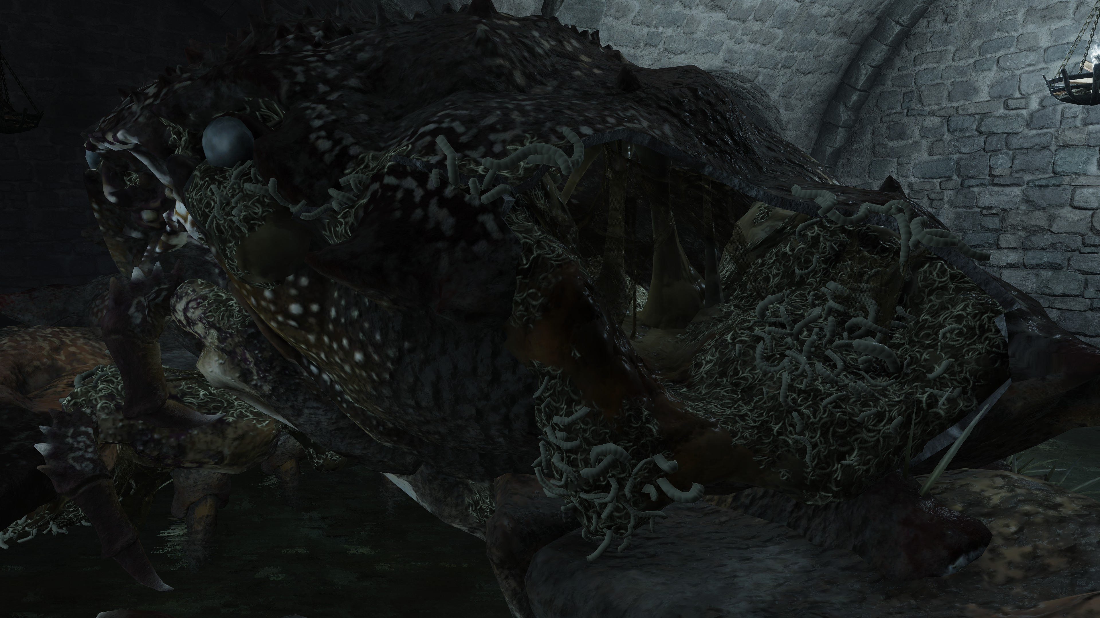 Due to the underlying cause, this curse of life only affects humans with gold gracing their eyes. However, this doesn’t mean that the curse can’t be passed on to other living beings. Although most animals out in the wild don’t exhibit signs of physical degeneration, this excludes crabs. Among the various types we encounter, one is just the standard crab with a body hollowed out by maggots, no different from the human rotten Hollows. We can presume that this is because they eat the dead’s flesh — you are what you eat, as the saying goes. Indeed, the Black Knife Catacombs have no Hollows in its flooded chamber, just countless crabs big and small feasting on the grave soil, all maggoty. Contrast to Wyndham Catacombs, where only two giant crabs dwell in its own flooded chamber, both still ordinary even as they feed from the same dirt. The major difference is that most of the dead there have yet to be scavenged, rotten Hollows and crawling carrion lingering alongside the crabs. This strongly suggests that feeding too much on the living dead results in the crustaceans inheriting the curse.