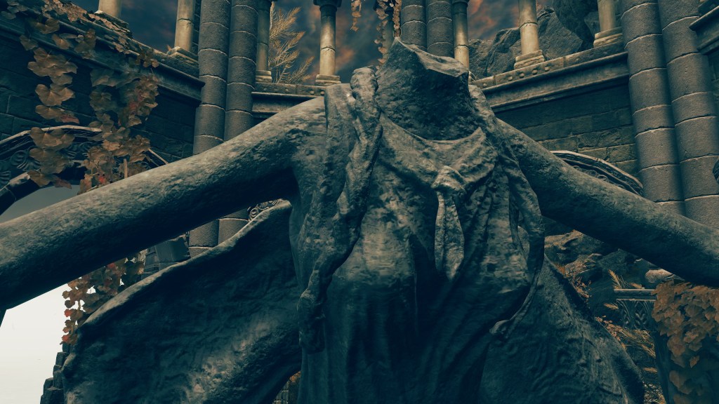 Taken altogether, Radagon is still considered an ally to the Order, and so not restricted to the same extent as Marika. The Elden Beast prefers using the king consort as its agent while it focuses on suppressing the god-queen, which appears largely successful. Beyond supposed communications with certain characters in the outside world, she takes no substantial actions, not even to resist captivity. The way her stone body hangs, the woman almost resembles a corpse, with references to a “DeadMarika” in the game files suggesting that such was the developers’ intention. Ironic as it was for a woman who imposed the same kind of justice, her crucifixion represented the death of god in any meaningful sense. From that point on, the fate of the Order and the world it regulated would be decided by her next nominal partner, the Elden Lord. She has become simply host to that future.