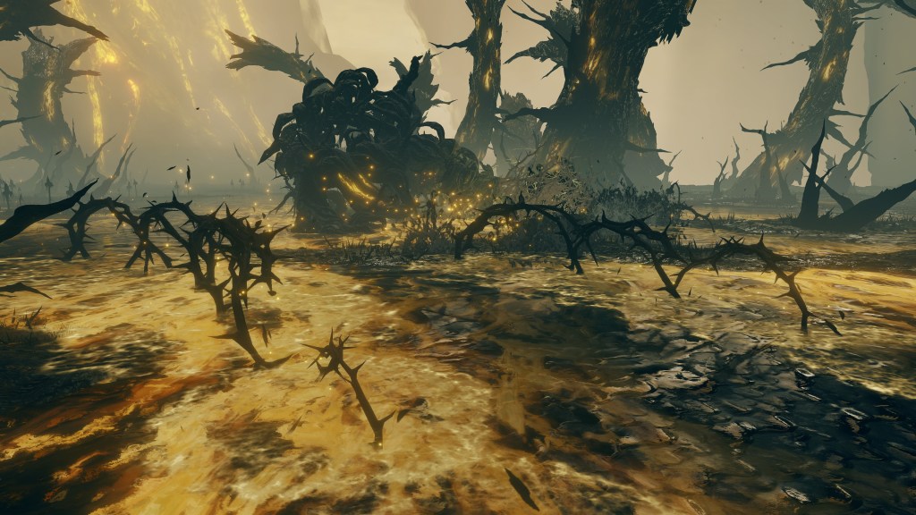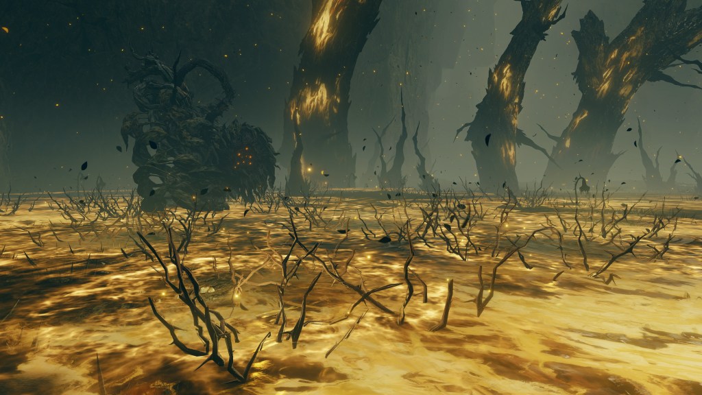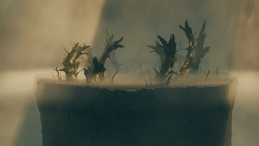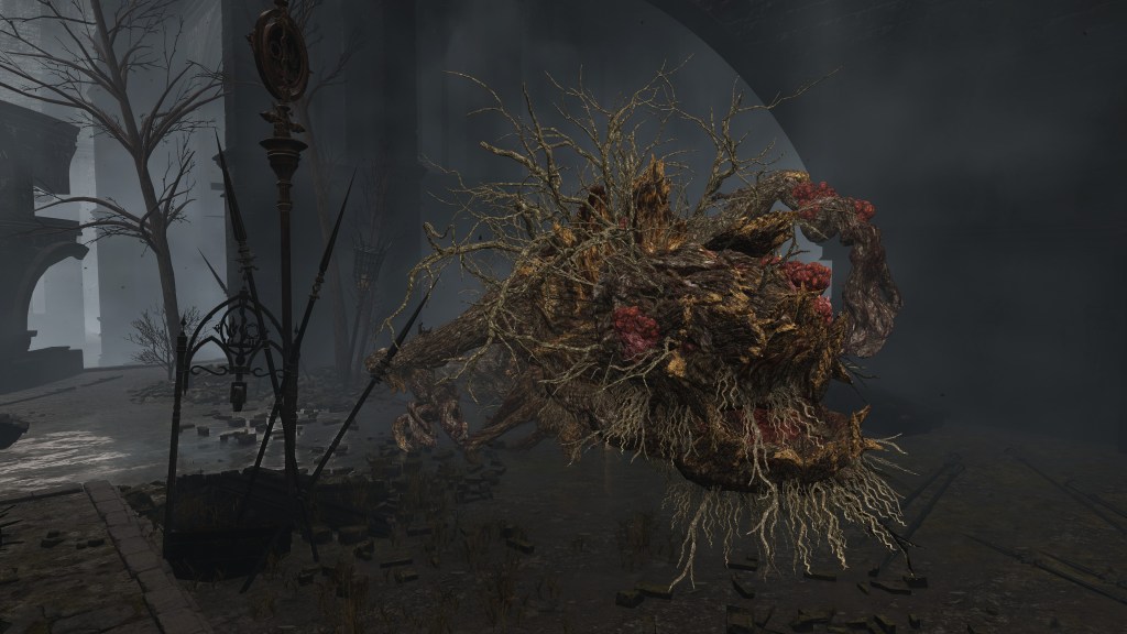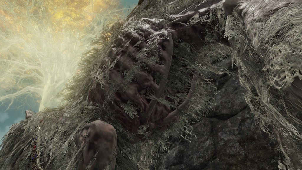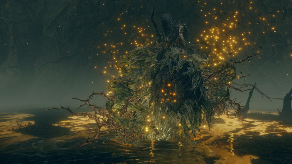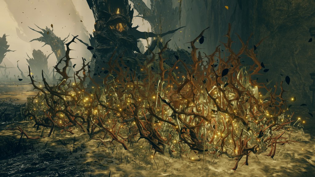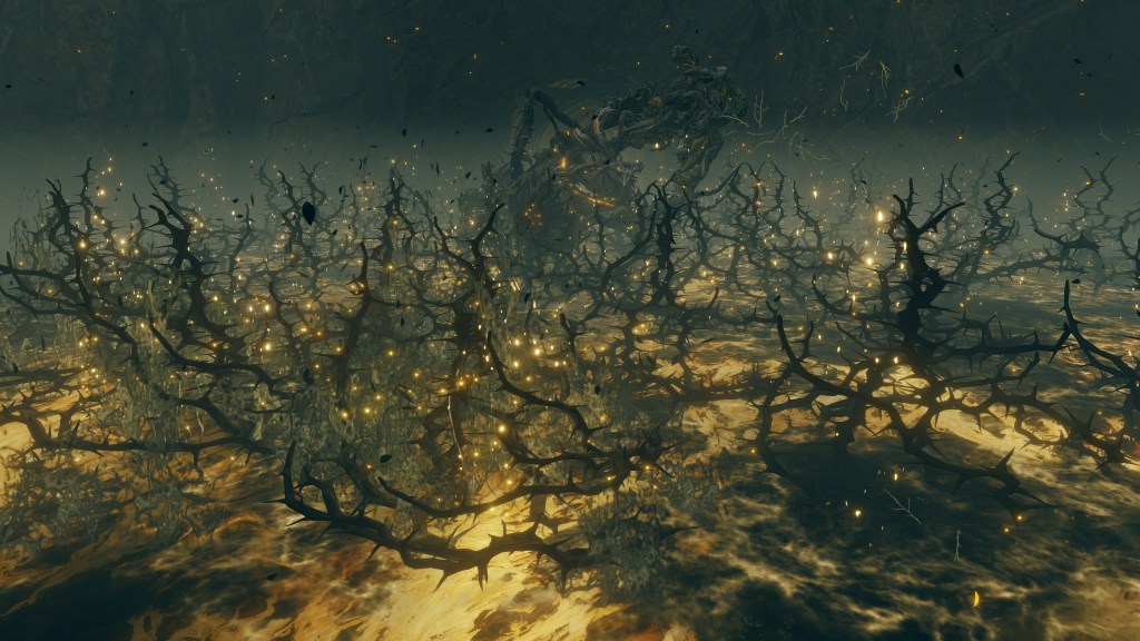 Much of the same took place in the Realm of Shadow. The Scadutree experienced a similar outburst of power which worshipers captured as an incantation, the name and ranged effect of this Wrath from Afar reflecting their understanding of the true source of this shock. Because the Erdtree’s shadow is so frail and twisted, this shockwave appears to have caused real harm to said shadow. The tree broke from within, scattering countless small fragments across the entire realm — not to mention the many larger fragments which simply fell and litter the tree’s base. Among the wreckage was also born the Scadutree’s own avatar, a “legless” humanoid shadow sunflower mirroring the tree’s crooked form in contrast to the “headless” walking trees in the Lands Between. When slain, another sprouts up in its place, the same boss seeming to regrow its form from the roots. Otherwise, the persistent avatar relies more heavily on thorns to keep threats away. For a tree already twisted by dark thoughts, death from a “friend” no doubt comes at little surprise.