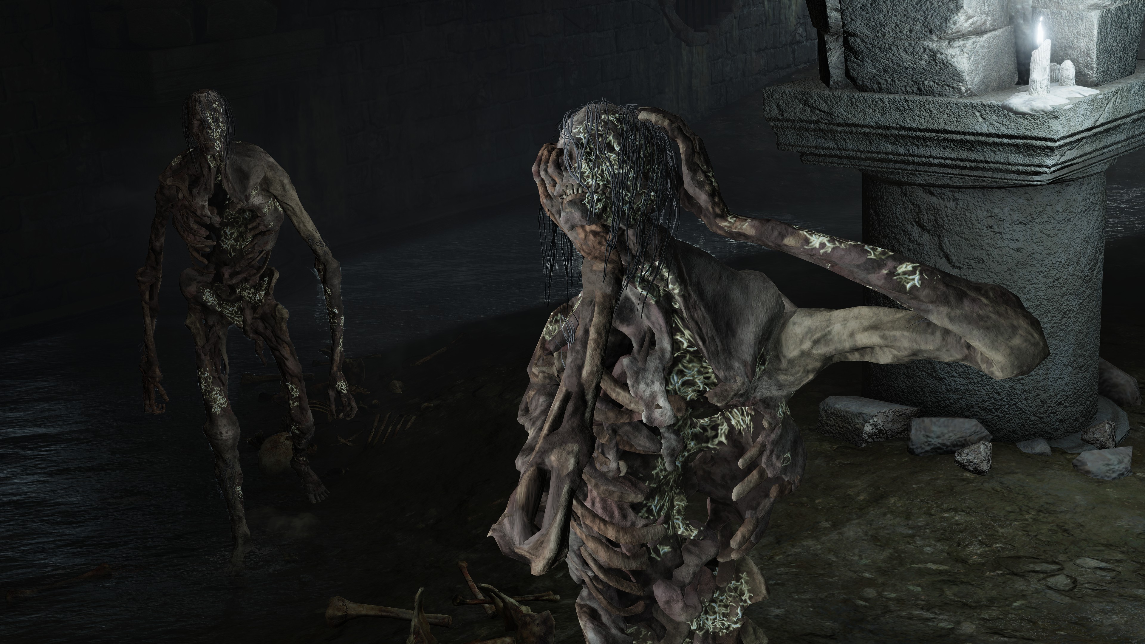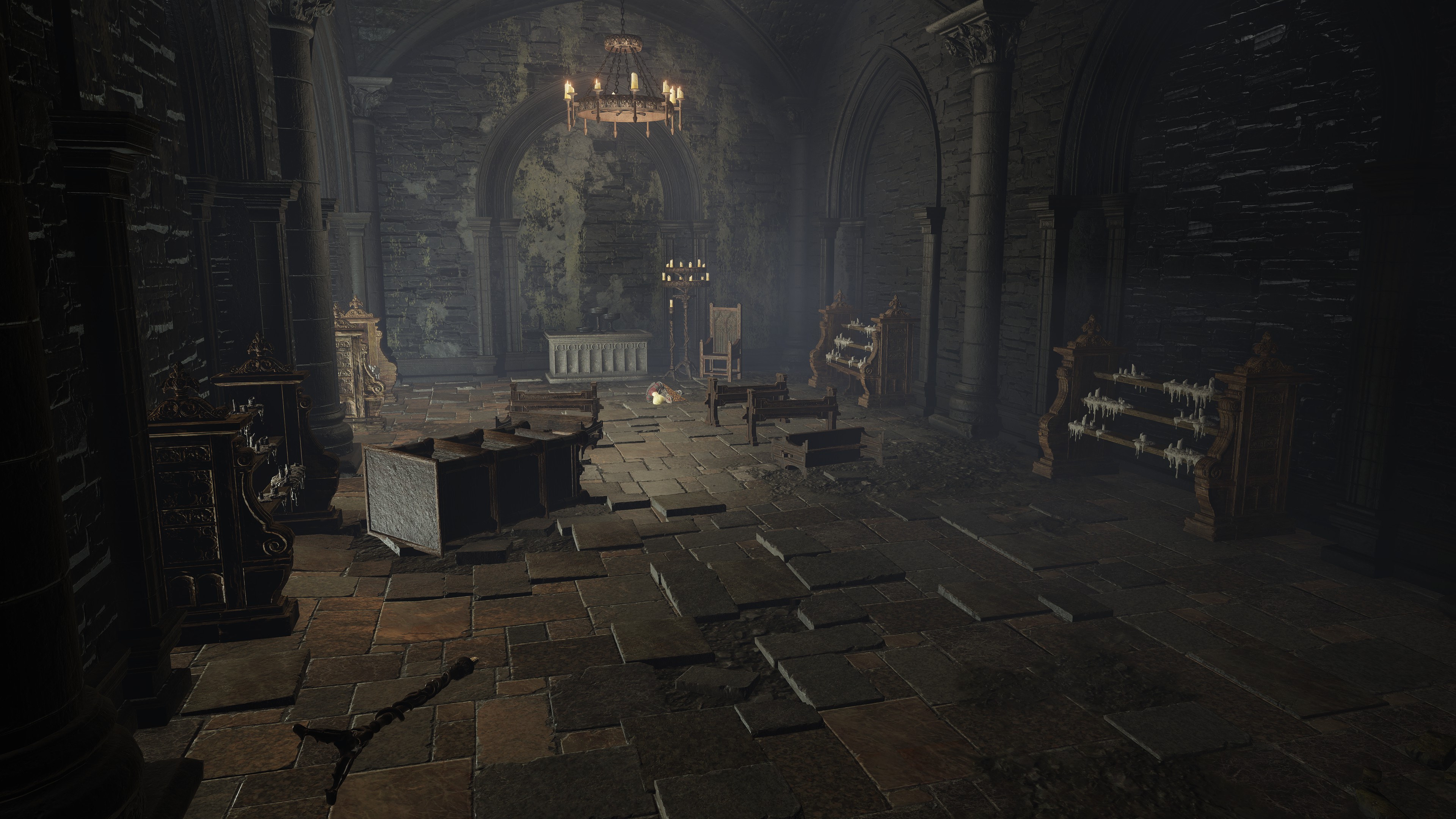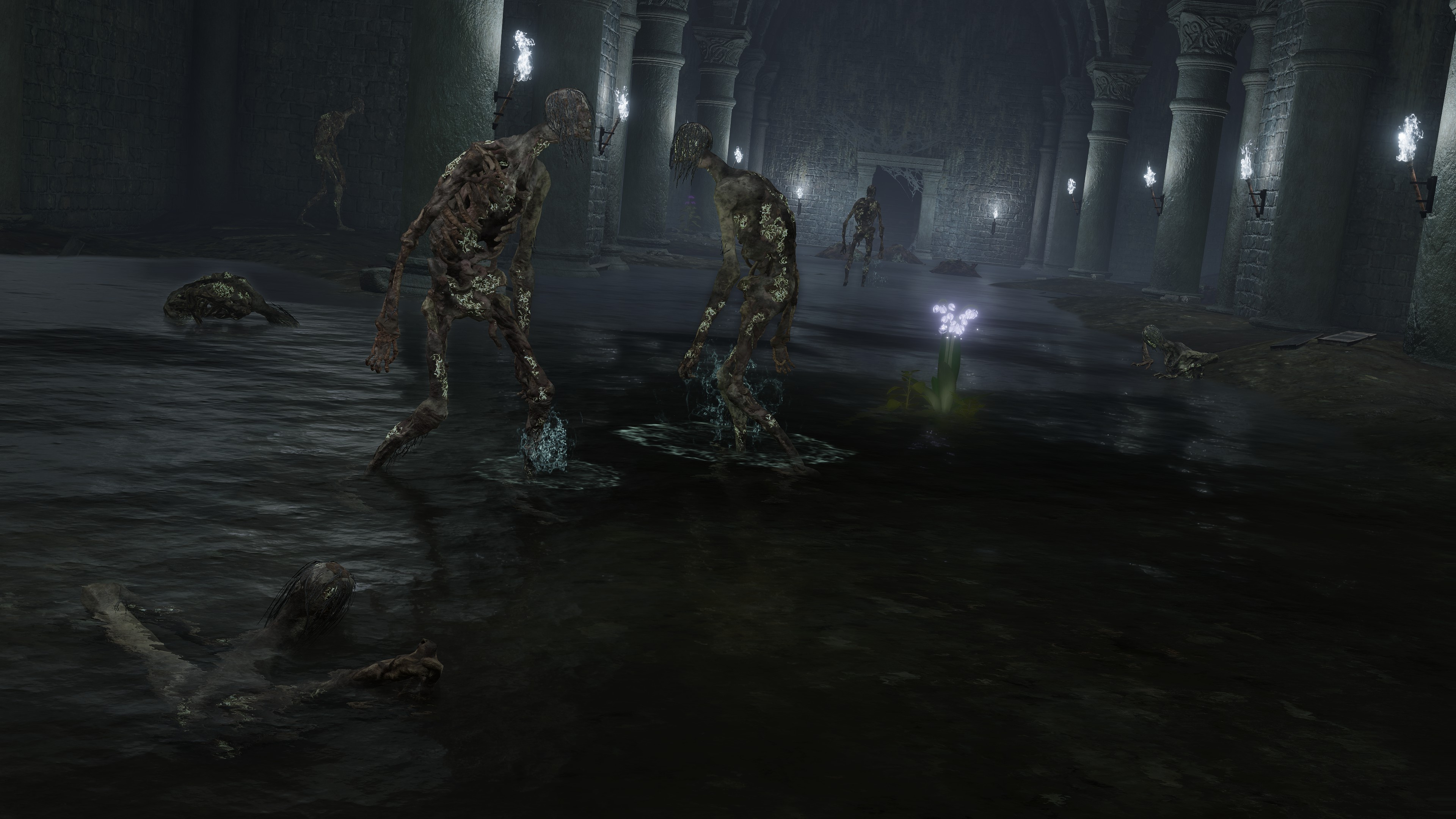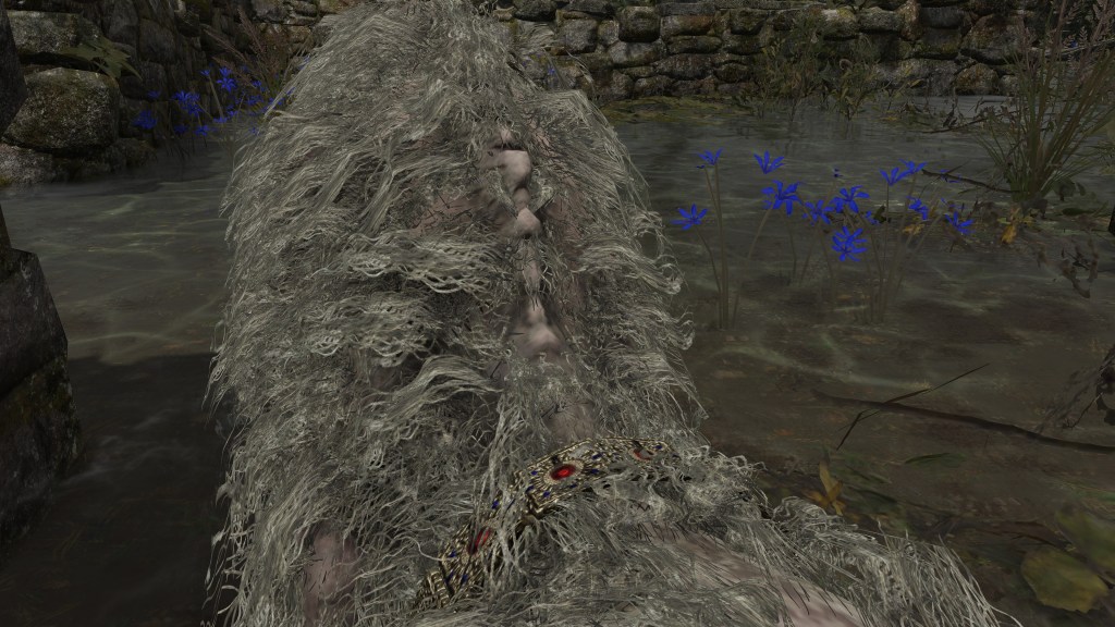 Although the return of Hollows for basic enemies in a FromSoftware title is hardly accidental, they are still distinct in their relationship to the dead. As noted earlier, Hollows technically classify as the living despite appearing corpse-like, but that doesn’t mean that they can’t manifest from among the dead as well. The rotten corpses so often rising from graveyards and body piles across the Lands Between are also expressly rotted “Hollows”, (腐った亡者) their time spent thoroughly eaten up by grumbles of maggots before life returned them to their feet. That may imply that some Hollows revive slower than others, but whether they be the recent or long dead, these rotten Hollows are just as much affected as those who have never died. In the latter cases, they seem to rise up because their rest has been disturbed, typically appearing where their burial chambers are flooded. This isn’t surprising with Erdtree Burial proving elective, both Kristoff and Lhutel’s examples postdating the broken Order. If the long-lived can choose when to rest, then the long dead can “choose” when to live again.