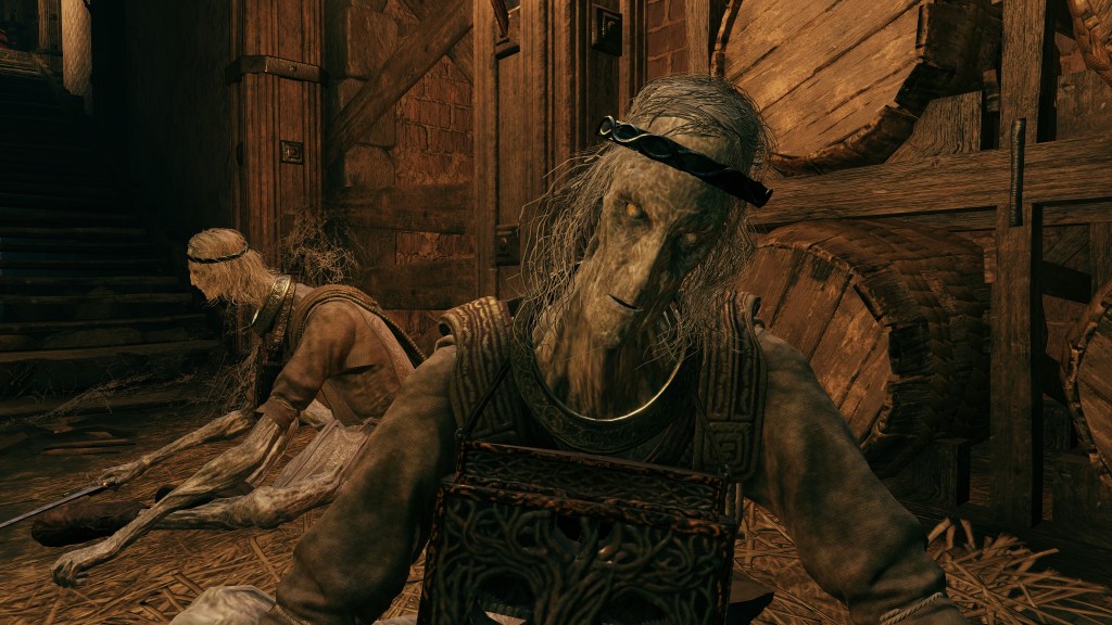 Based on the highwaymen’s example, it is death that universally accelerates this mental degradation, which explains why we can witness groups continue to behave sentient with social cohesion in select scenarios; they have yet to die, at least enough to become mental invalids. This gives the nobles in Site B added incentive for extreme measures like Agheel to do them in — anything less might just lead to more quickly losing their minds. To become mouja is a kind of existential horror where one comes to meander the world as little more than a monster, devoid of self yet driven by instinct. All of this is appropriate given that the same term was previously used for soul-starved “Hollows”, the basic enemies of Demon’s Souls and Dark Souls. Because all three iterations share many of the same degenerative traits, I will refer to mouja as “Hollows” in this context as well going forward.