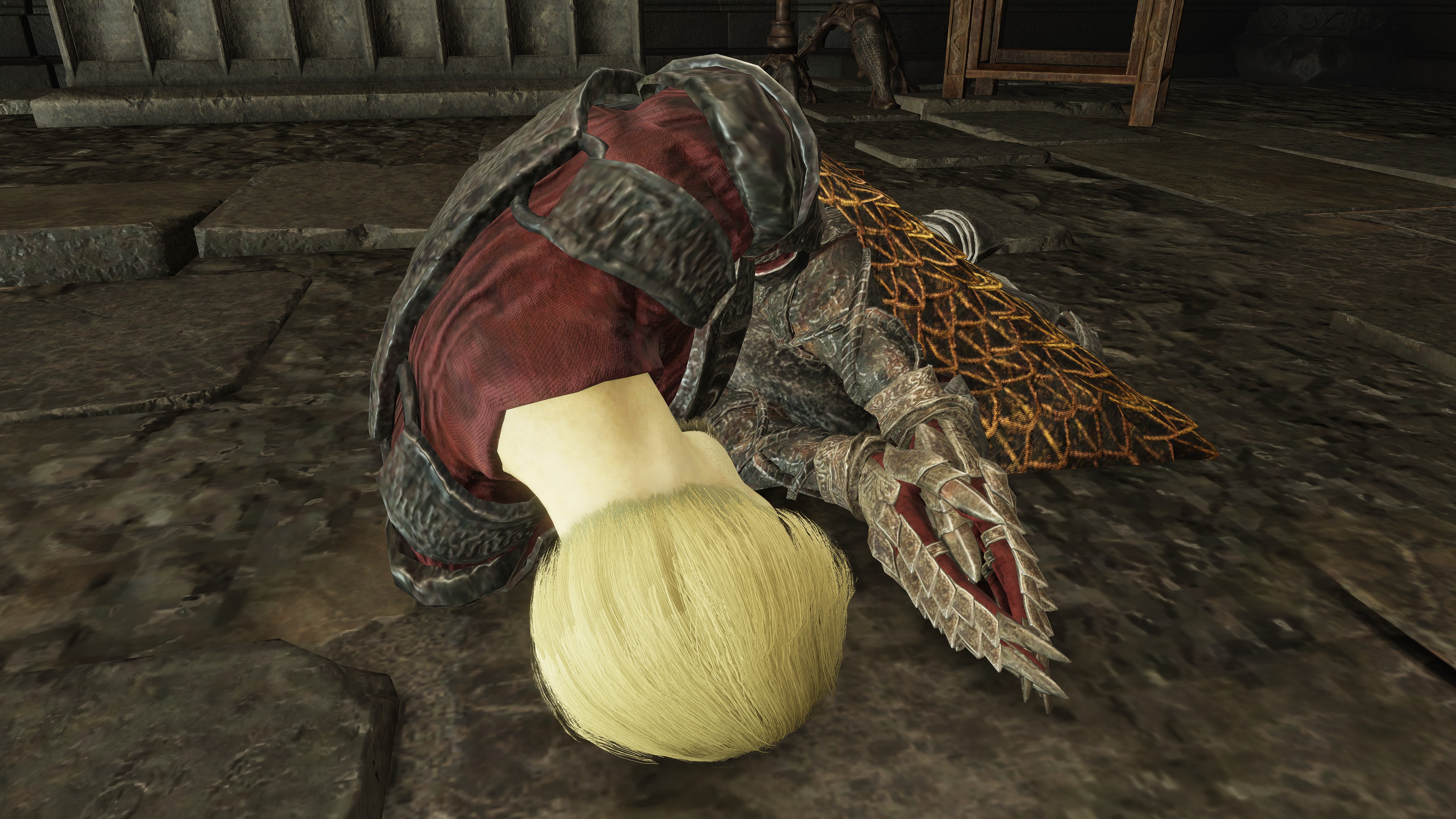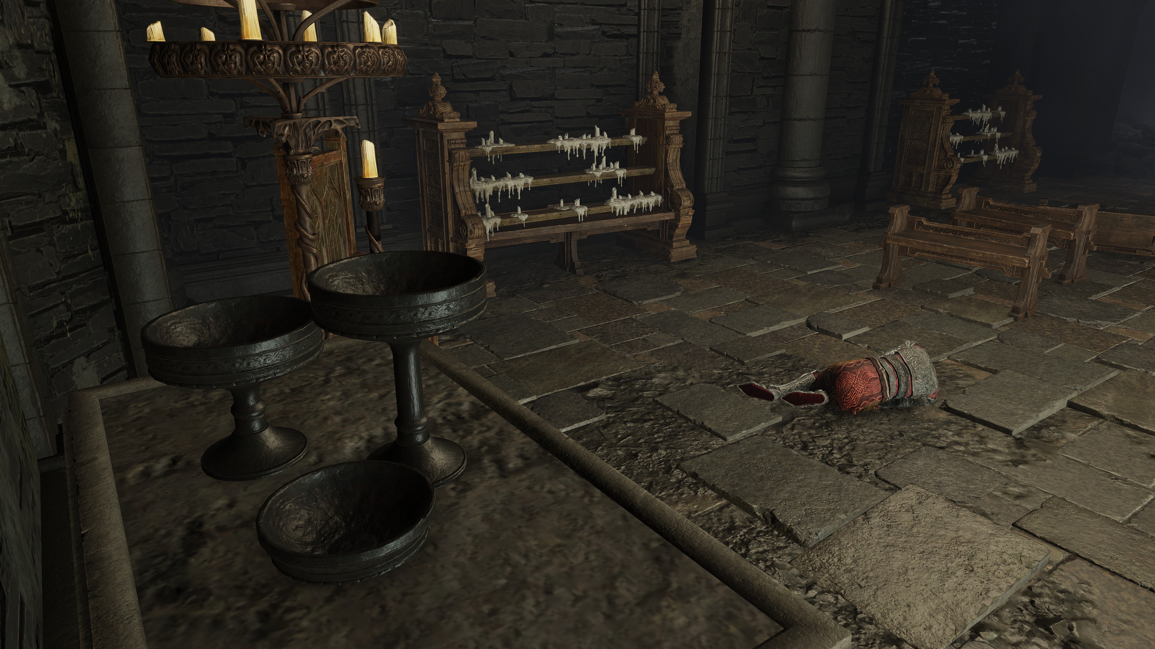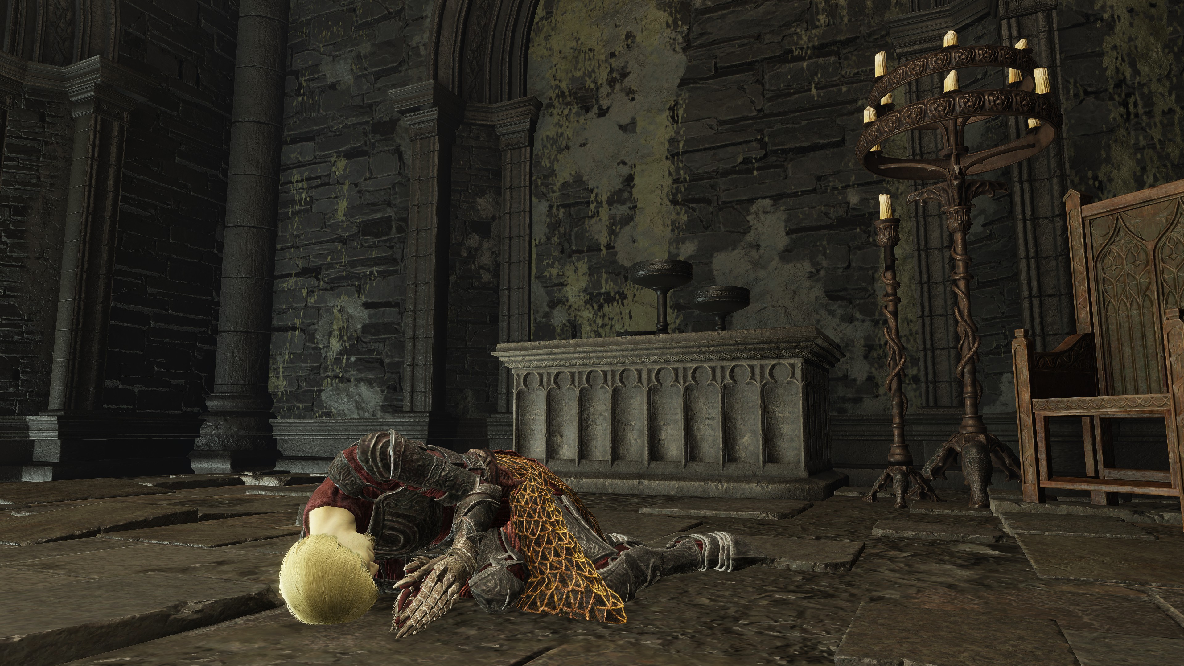 For all the mantra he recites, Queelign seems to feel insecure about their “mother” Marika. When the Fire Knight is defeated during his second invasion at the Church of the Crusade, he begs the goddess not to abandon him, as if fearing her idol there is actually watching his performance; if he wins, he just as proudly proclaims victory to her instead. Queelign has staked his everything on Marika’s favor, which is now in doubt with the Golden Order broken. Visiting the man curled upon the floor of a side chapel in the Shadow Keep’s main church afterward, he can only weakly beseech her not to “rob” him of golden grace’s light after everything he did to ease her worries. Magnifying his fears with an Iris of Oculus, he wonders why she has robbed them of light like the “filth” they crusade against for besmirching her honor. Queelign may claim that those lacking gold can’t escape from Messmer’s flame, but it is ultimately he who can’t escape the fears burning at the back of his mind. All that time following her guidance of grace has proven futile, and there is only much even Fire Knights can lose themselves in denial.