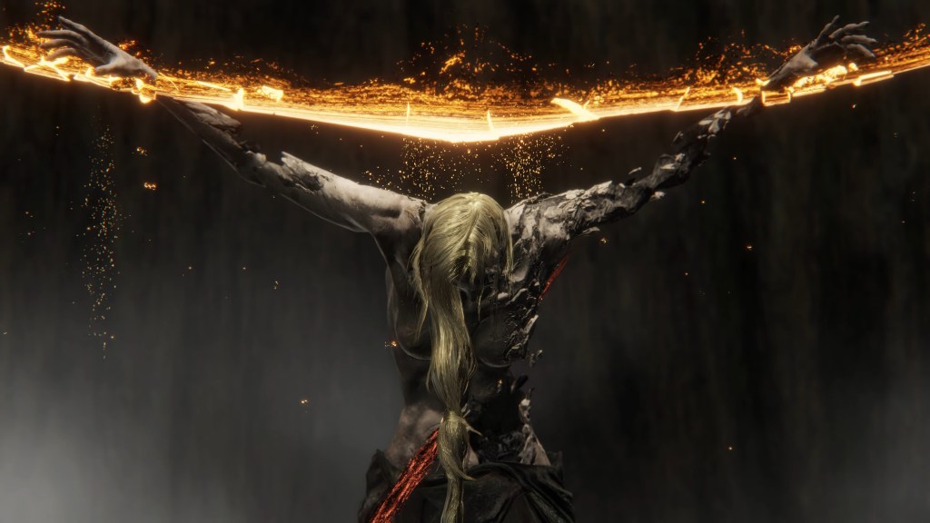 But the sin was indeed committed, and it is likely for that reason that Radagon shares in Marika’s punishment. He was the one who failed to rein in his other half, making him just as guilty in Gold’s eyes. As her “better” angel, the so-called dog shouldered the burden during that fateful moment, and the Elden Lord fell miserably short of the Order’s faith in him. As a result, it has stepped in to discipline them both, though the Elden Beast still seems to entrust the man with certain responsibilities. While holding them captive, the Ring nestles itself inside Marika and Radagon’s broken shell of a body, its shadowy manifestation holding the crumbling husk together as the hero king battles on its behalf. It is only after failing it again, losing to us in battle, that the Elden Beast rises from the shadows, literal and metaphorical, once more. We can therefore infer the beast responsible for the crucifix arc fracturing so that Radagon can be freed to fight just as we enter. Clearly, it trusts Radagon’s ability to keep his other half suppressed and defend what is left of the Order in this moment.