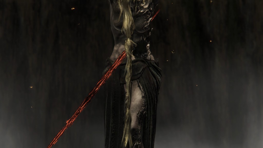 Meanwhile, the cause of death didn’t escape punishment. Even if she ultimately won out in the battle of wills, Marika still ended up captured for her actions. The one doing the capturing was presumably the Elden Ring itself. When grabbed by the Elden Beast, we find ourselves crucified in a similar manner to Marika, hanging from a rune arc as a multitude of golden spears run us through from all angles, culminating in a collective explosion. In the Eternal Queen’s case, she has only the first spear stabbed through her right side, referencing the spear in Christ’s crucifixion. This golden spear has a more reddish hue like the Crucible, suggesting that it is an especially dense concentration of power — maybe necessary to keep a god suppressed. Unlike in our case, the intent wasn’t to kill Marika, per se, but prevent her from acting independently. Despite everything, she remains the Ring’s host, thus is left suspended midair in probable pain to suffer while deprived of agency.