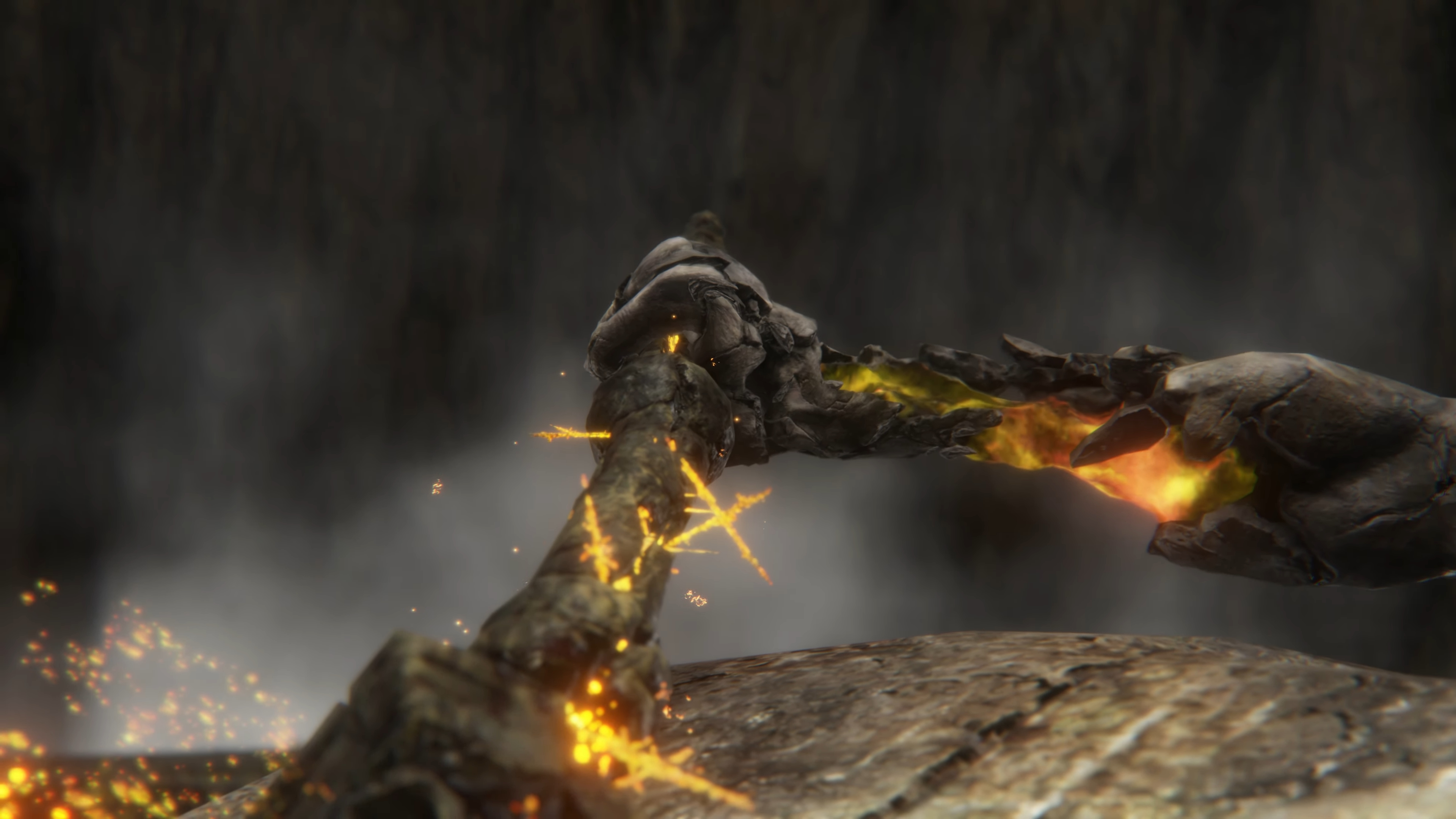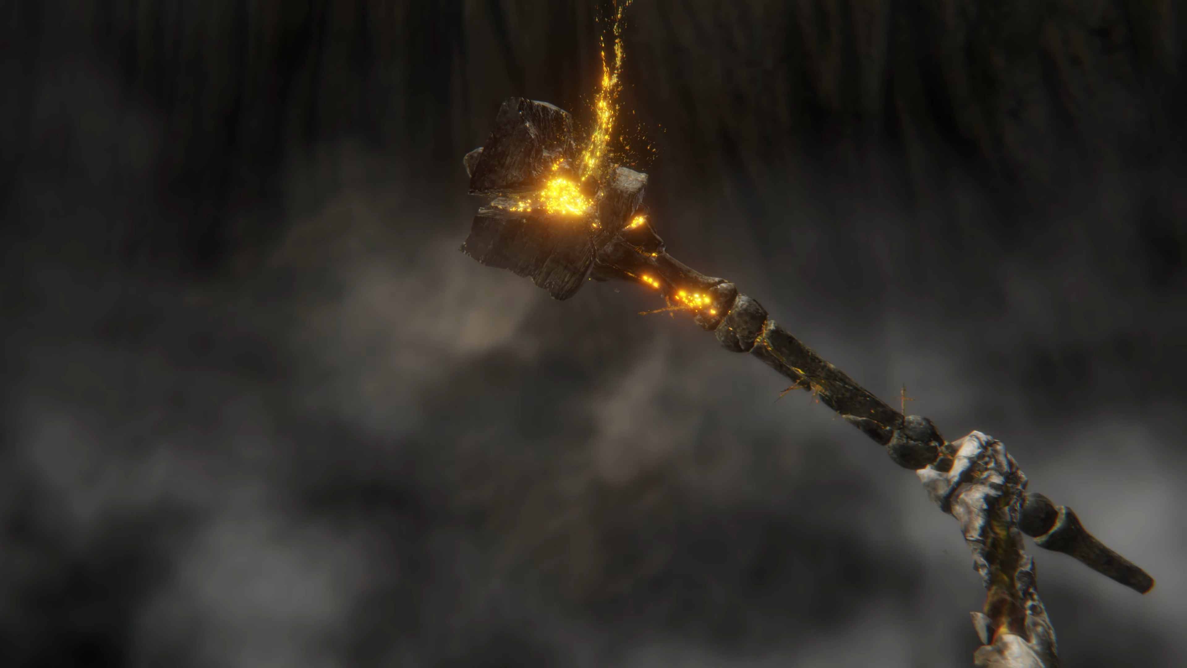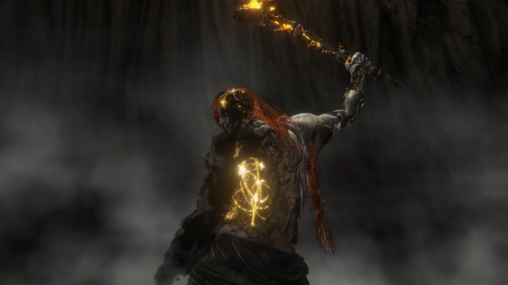 Before that, we see a flash of light, which the hammer’s description defines as a kind of shock. Certainly, the force of shattering the whole collection of runes into pieces has left the weapon deeply entrenched in the arboreal pedestal; Radagon can only remove the weapon with great effort, destroying the pedestal along with it. The reaction force was so strong, it partially shattered the hammer, with splinters of the Ring filling the cracks. Those same fragments of gold appear to be holding the broken pieces of hammer together — albeit it is invisible until Radagon draws the power out, the runes resonating with the gold of his fractured body upon grabbing the hilt. However, it is that same power allowing the heroic Lord to perform his signature move as the weapon’s skill, turning it effectively into a holy catalyst. The fact that the hammer can be used in this way speaks to the power the stone was manipulating and had now unleashed with this shock.