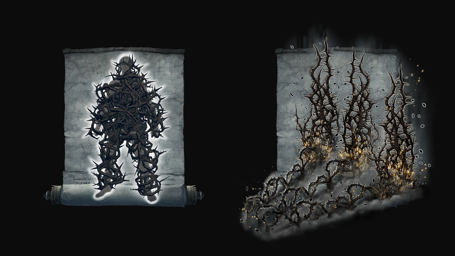 That realization brought even the most devout within the Shadow Keep despair. As a result, a few abandoned prayer in favor of sorcery, devising spells like Mantle of Thorns and Impenetrable Thorns. As the names imply, they take cues from the Scadutree, rejecting everything beyond themselves with prickly harm. While the arts may rely on faith to cast like other thorn sorceries, the writings are decidedly works of observation, not incantation. In their despair, they looked to the tree, forsaken like them, for guidance on how to react. Whether part of an informal collaboration between the clerics and researchers or their independent invention, both parties were involved going by the sorceries’ location in the Church District or Specimen Storehouse. We don’t see anyone cast these sorceries, however, so any sorcerers were likely culled from the ranks as with the other turncoats. Still, that wouldn’t solve the underlying despair, which reaches to the highest levels.