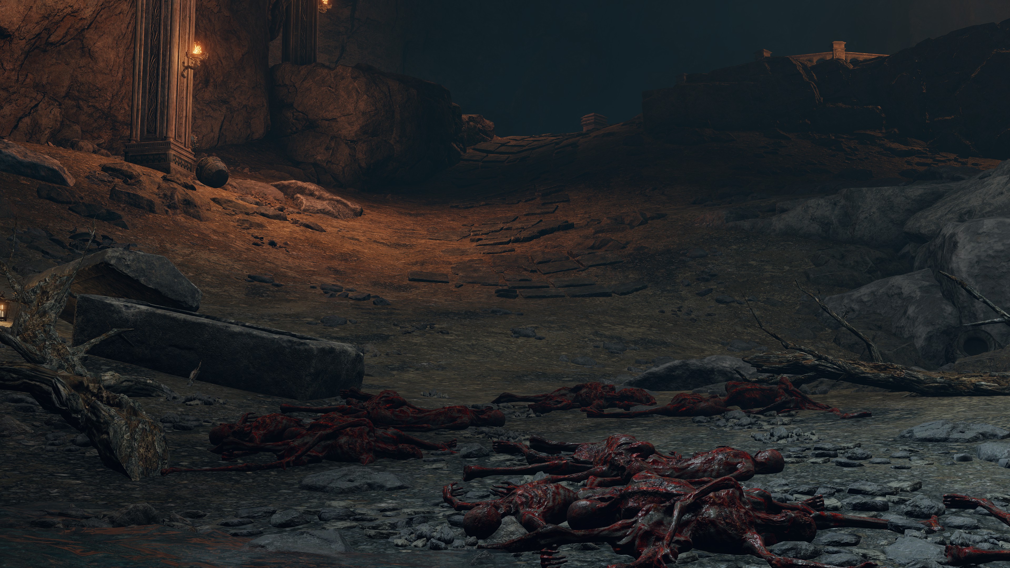 Opposition was met swiftly and harshly. The remaining Lower Town has become the sight of a massacre, bodies left to rot in the streets. The weapons stuck in one of the many piles give away that it was the work of the garrison, who operate beneath the main avenue dividing the quarter. And seeing how all their buildings have also been sealed with sap, rotten Hollows sitting in despair outside their homes, the wholesale slaughter was probably in reaction to a mass protest against the crackdown. After all, the Nox living in the Lower Quarter had largely been insulated from the wars of the Erdtree natives under Marika, only suffering briefly during Gransax’s attack even if it irrevocably displaced a huge chunk of their population. This was new to them, and no one wants to be forced out their home to be stripped of civilian life. But Morgott was not Marika, and he wouldn’t tolerate insolence with his precious Erdtree on the line. The town was purged without even the dignity of an Erdtree Burial, as we see a few skeletal gravekeepers try to give one body for its kin.