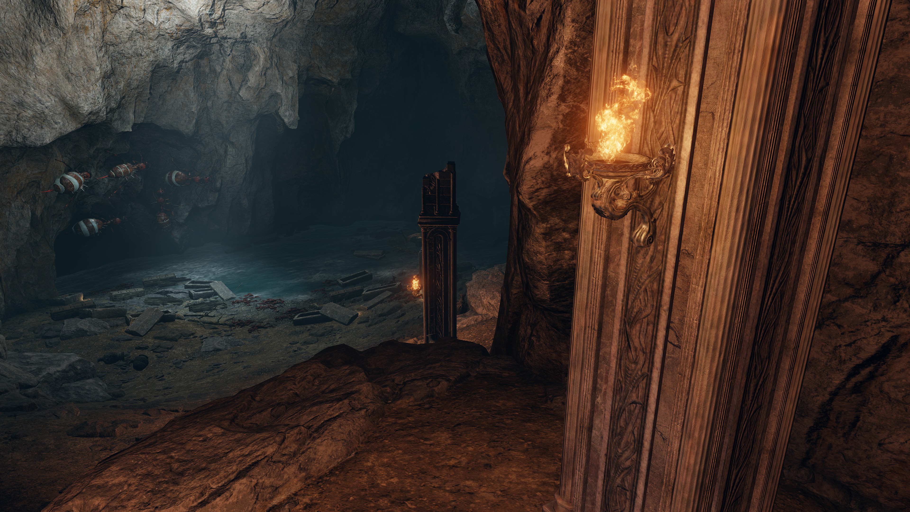 Most likely, a prisoner, condemned for the taboo imposed by Caria, has restarted research on the fringes, everyone in Liurnia too busy in the current anarchy to track him down. The golem was probably recovered from vicinity of the Divine Tower south across or the ancient civilization’s ruins further north, reprogrammed to serve its new master like those golems on Altus Plateau. While the magic giant safeguarded his supply, the prisoner could freely explore the deep underground, collecting the best specimens for the next experiment — and apparently burning the Nox torches by the work area with non-magic flame. In the end, death came for the convict, the merchant already looting the body for what little he was worth. Still, he demonstrates that more large-scale criminal operations are underway as the rest of the Lands Between reels from the shattering. Not even the Forbidden Lands are immune to this, as the Fire Monks slipping from duty showcase. But the cracks show especially in incidents outside of the institutions.