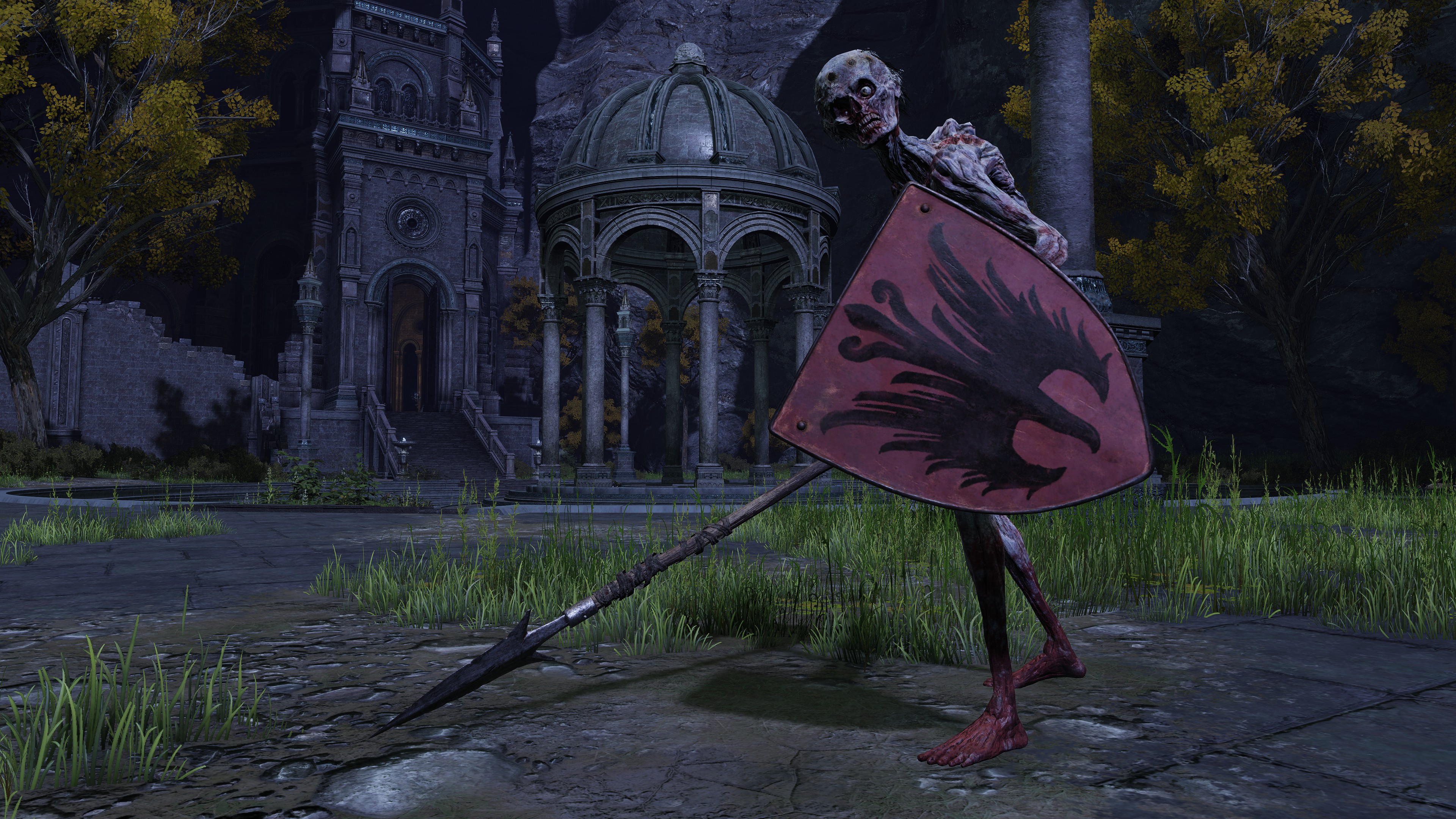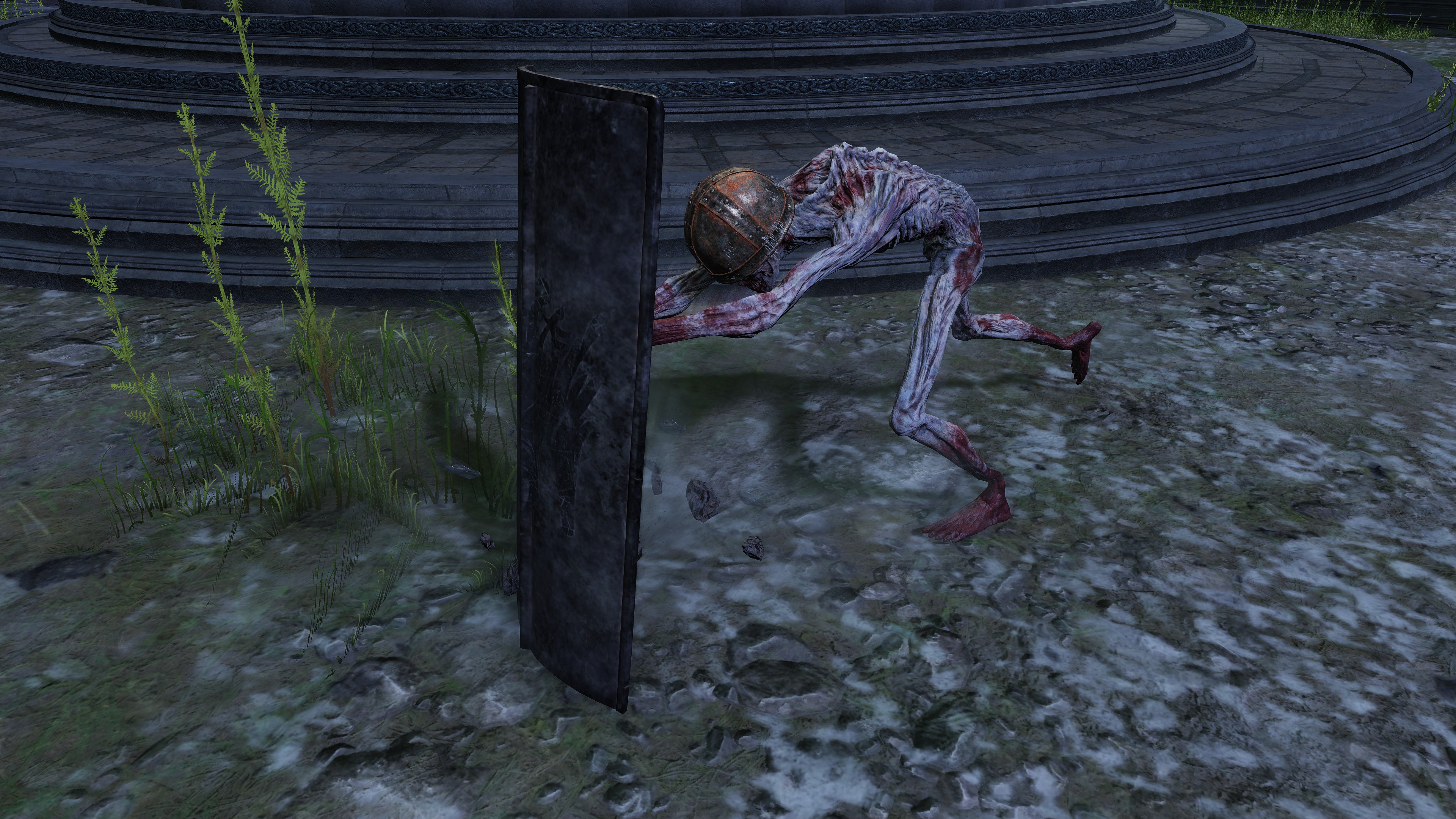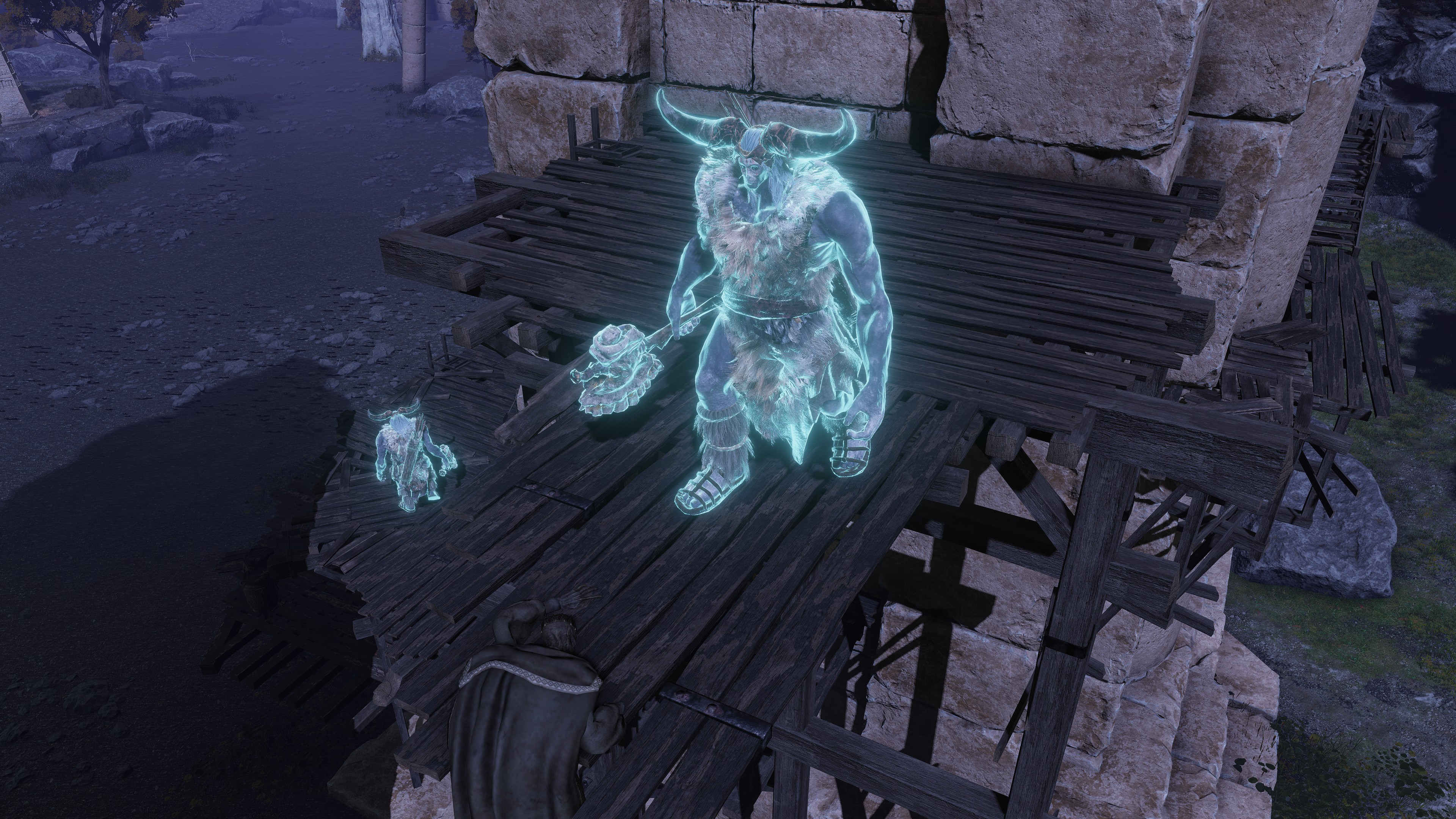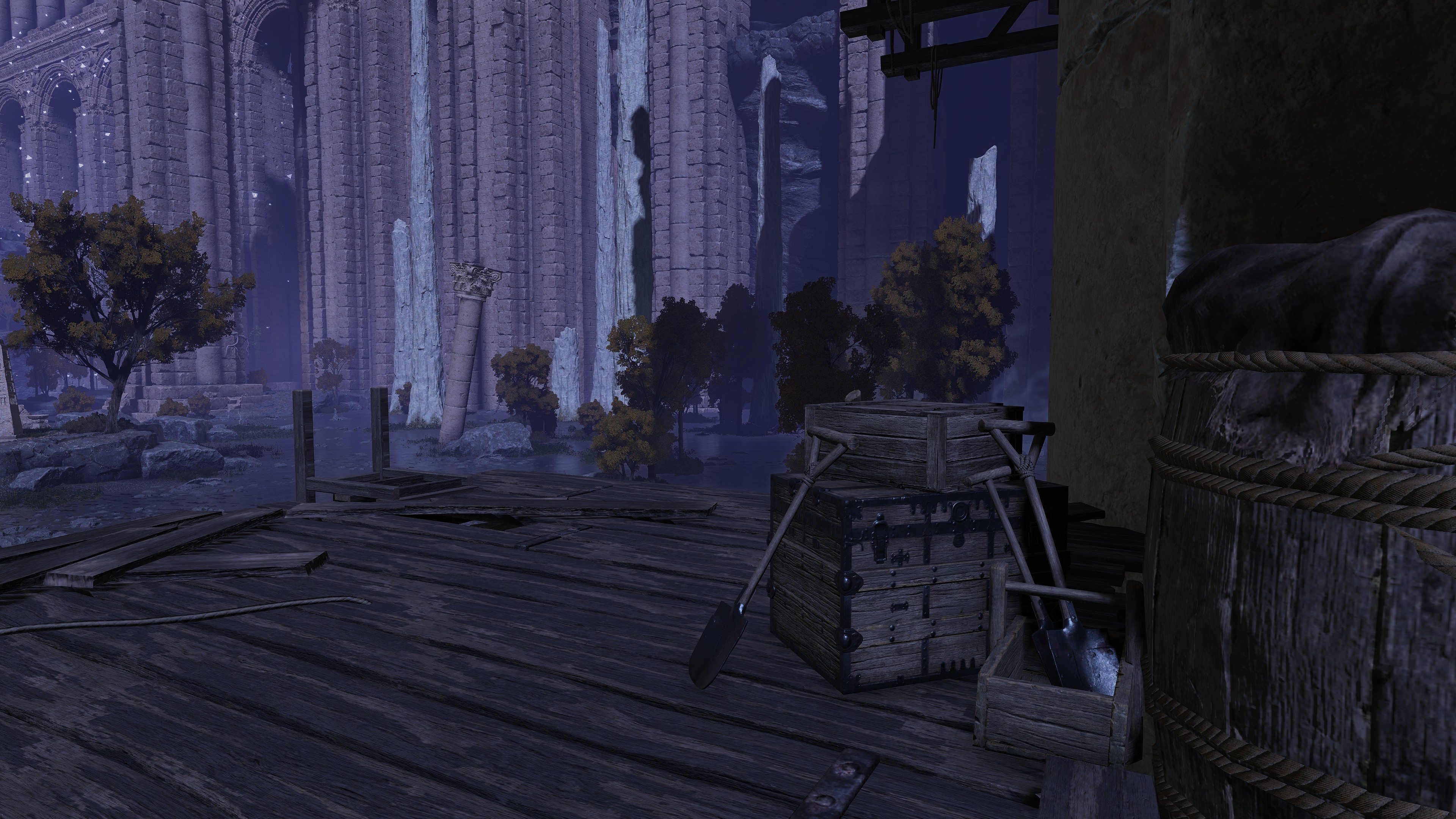 The company have been on this mission from their master for some time. When touring the Siofria River below Nokron, we inevitably come across large wooden platforms and bridges designed to climb the Ancient Dynasty ruins leading into the capital. We further obtain a medium shield bearing the company’s inverted hawk crest from a corpse encamped further downriver. Altogether, it is clear that the soldiers first tried looking for ways to reach the city, like Blaidd does for Ranni at present. One of their hair-brained schemes was to build a way up the ruins, even traveling with a nomadic merchant at one point. But they ultimately gave up on the plan, allowing Ancestral Followers to overrun it whilst abandoning their companion losing himself to the mad flame. Instead, they apparently found alternative ways of reaching Nokron, and the same for Nokstella. (not to mention Noklateo, as Nightreign later reveals) This has been a lengthy operation and is still ongoing.