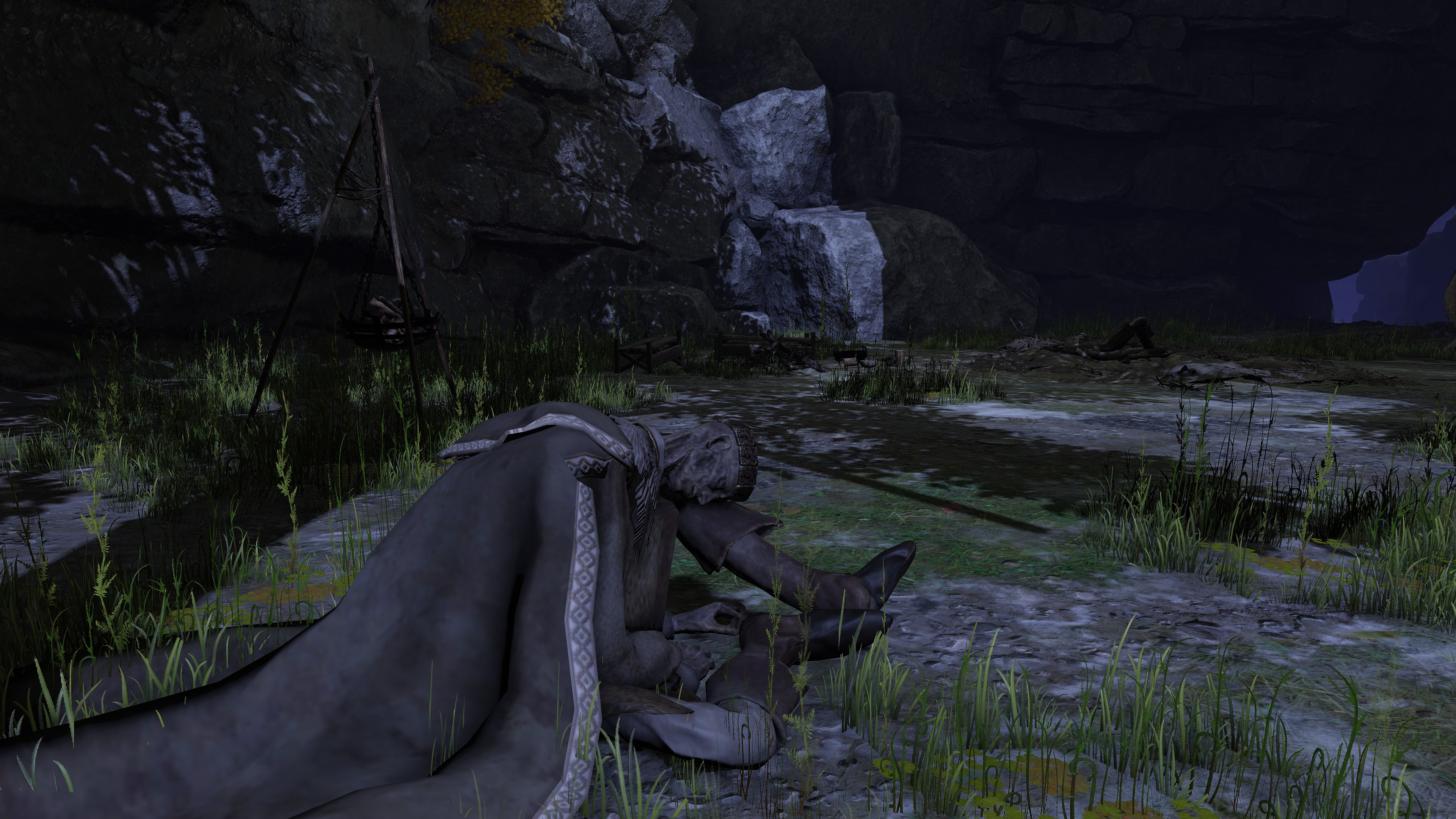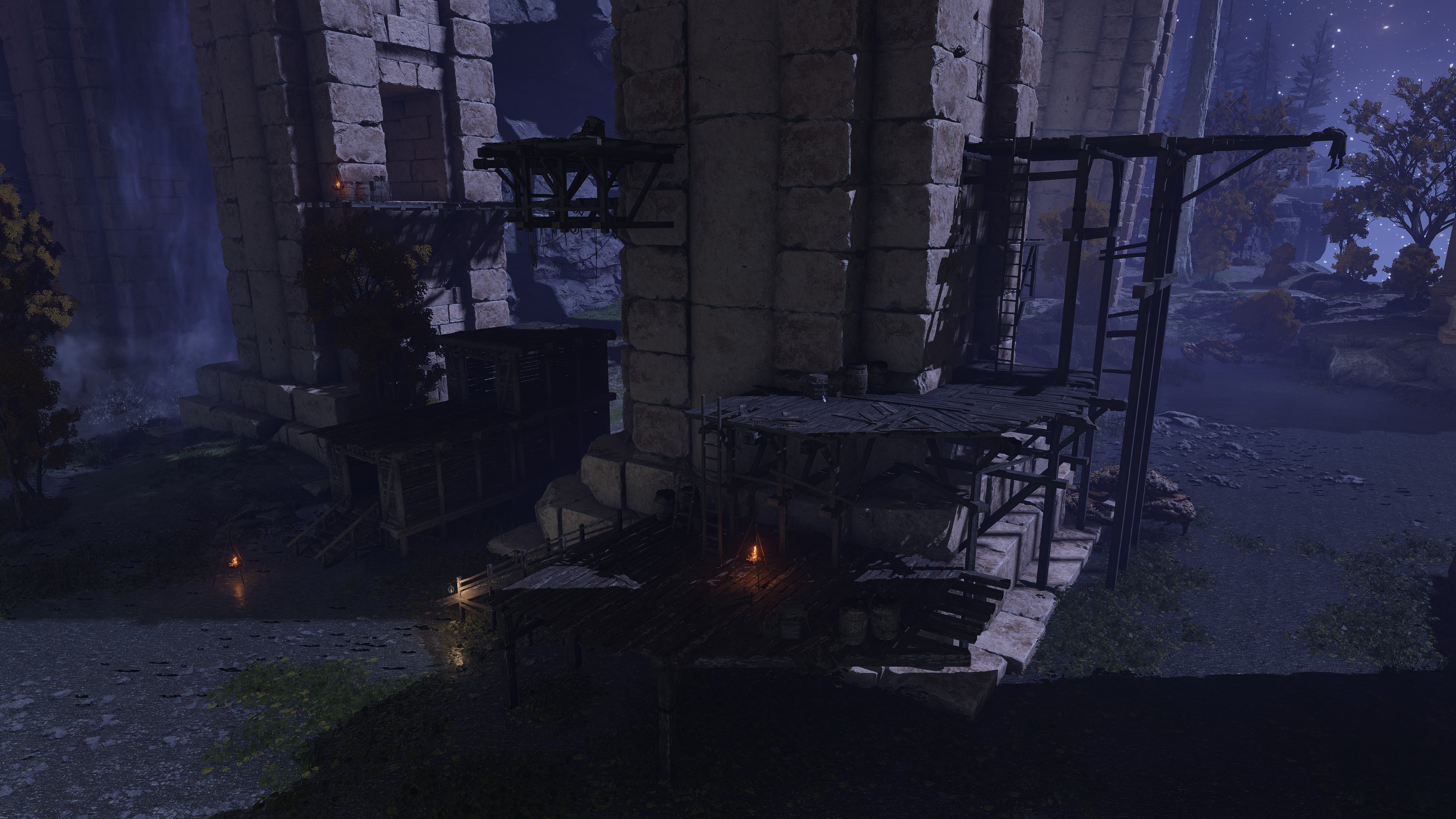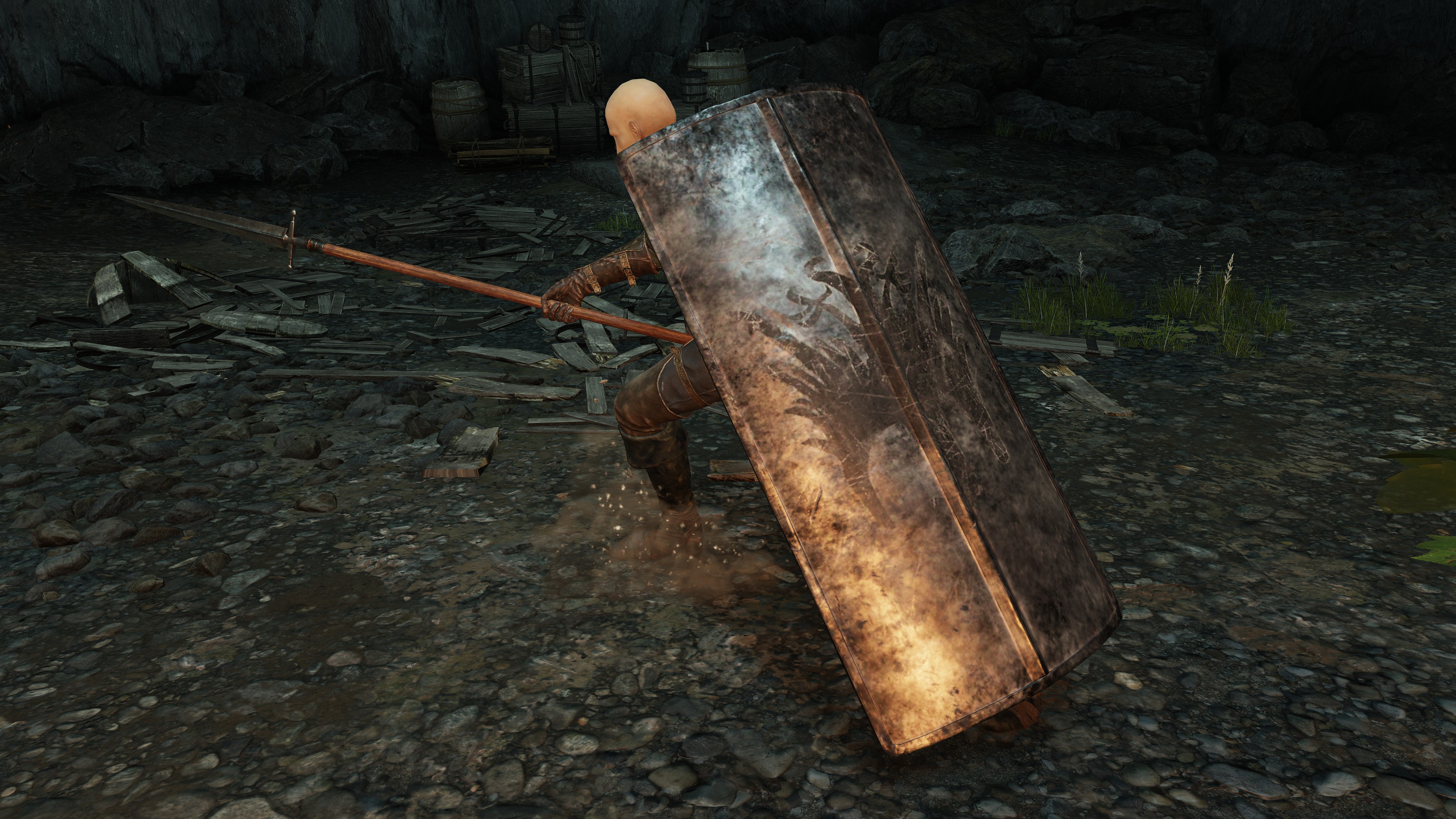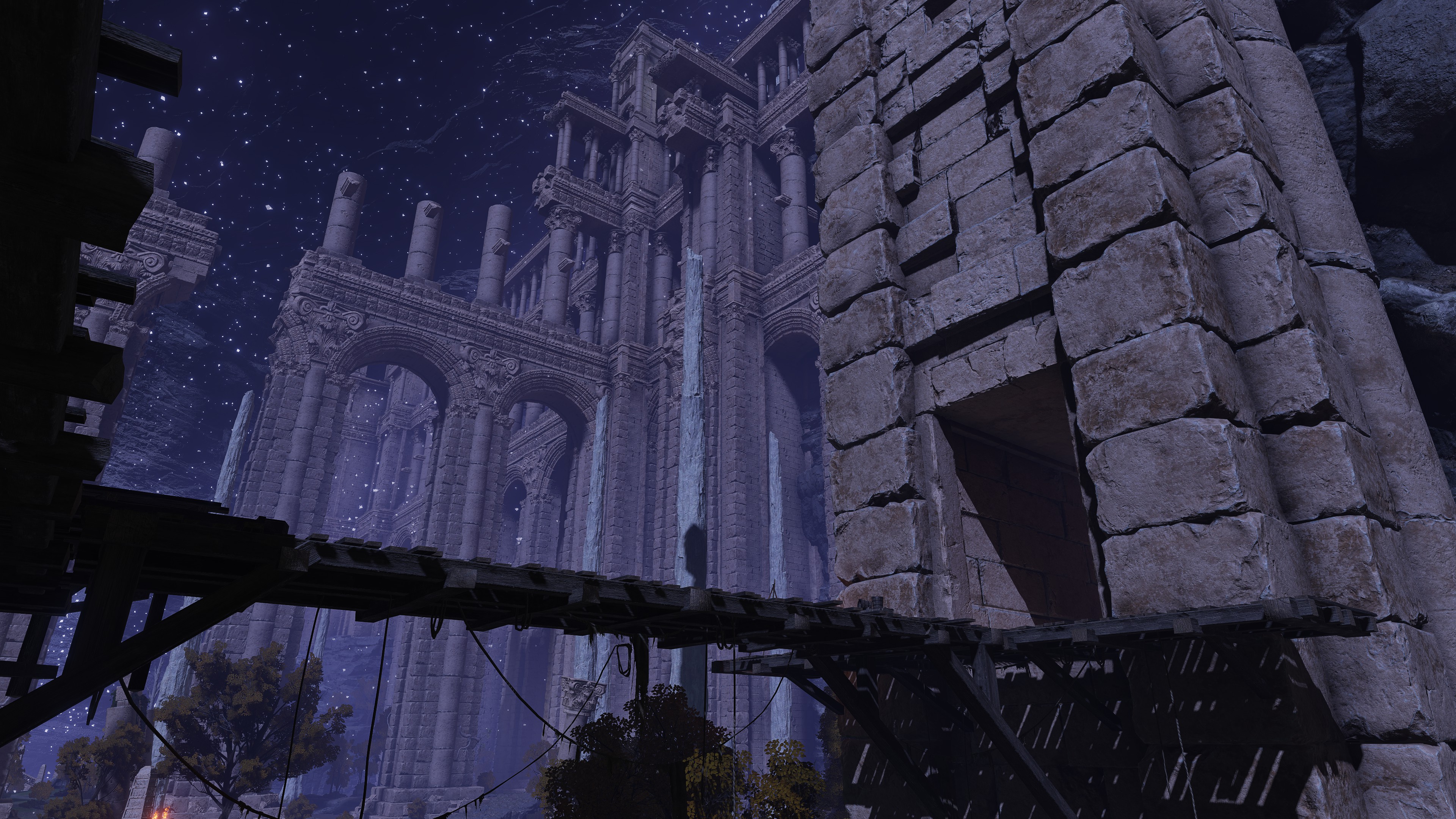 The company have been on this mission from their master for some time. When touring the Siofria River below Nokron, we inevitably come across large wooden platforms and bridges designed to climb the Ancient Dynasty ruins leading into the capital. We further obtain a medium shield bearing the company’s inverted hawk crest from a corpse encamped further downriver. Altogether, it is clear that the soldiers first tried looking for ways to reach the city, like Blaidd does for Ranni at present. One of their hair-brained schemes was to build a way up the ruins, even traveling with a nomadic merchant at one point. But they ultimately gave up on the plan, allowing Ancestral Followers to overrun it whilst abandoning their companion losing himself to the mad flame. Instead, they apparently found alternative ways of reaching Nokron, and the same for Nokstella. (not to mention Noklateo, as Nightreign later reveals) This has been a lengthy operation and is still ongoing.